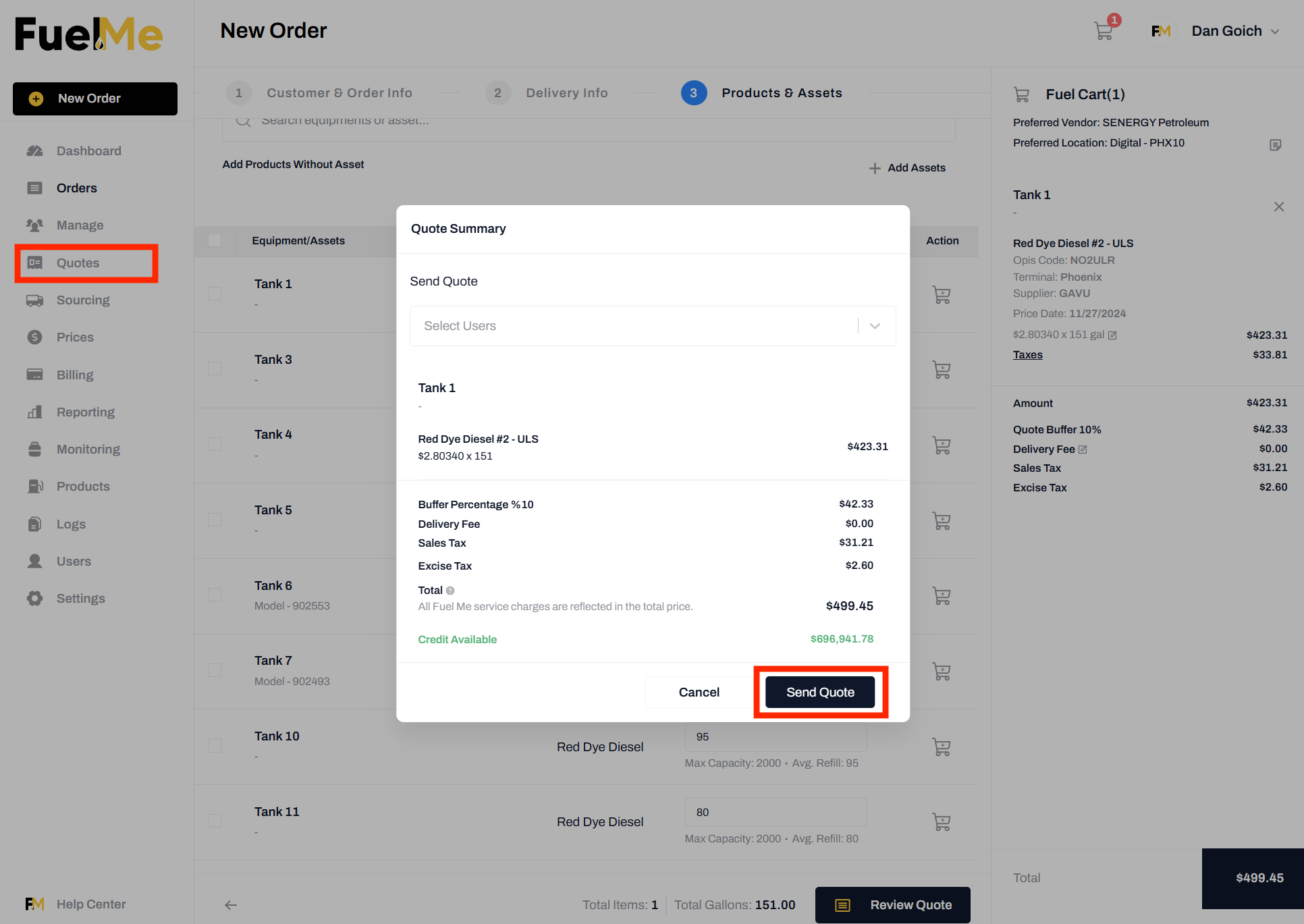 Fuel Me offers the capability to submit Quotes instead of Orders. If you are interested in having this feature enabled on your Account, please reach out to your Account Manager.