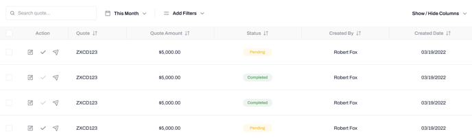 The Quotes List View will allow you to see and review all of your Quotes in one spot. You can quickly see which Quotes are still Pending and those that have been Completed by looking at the 'Status' column.