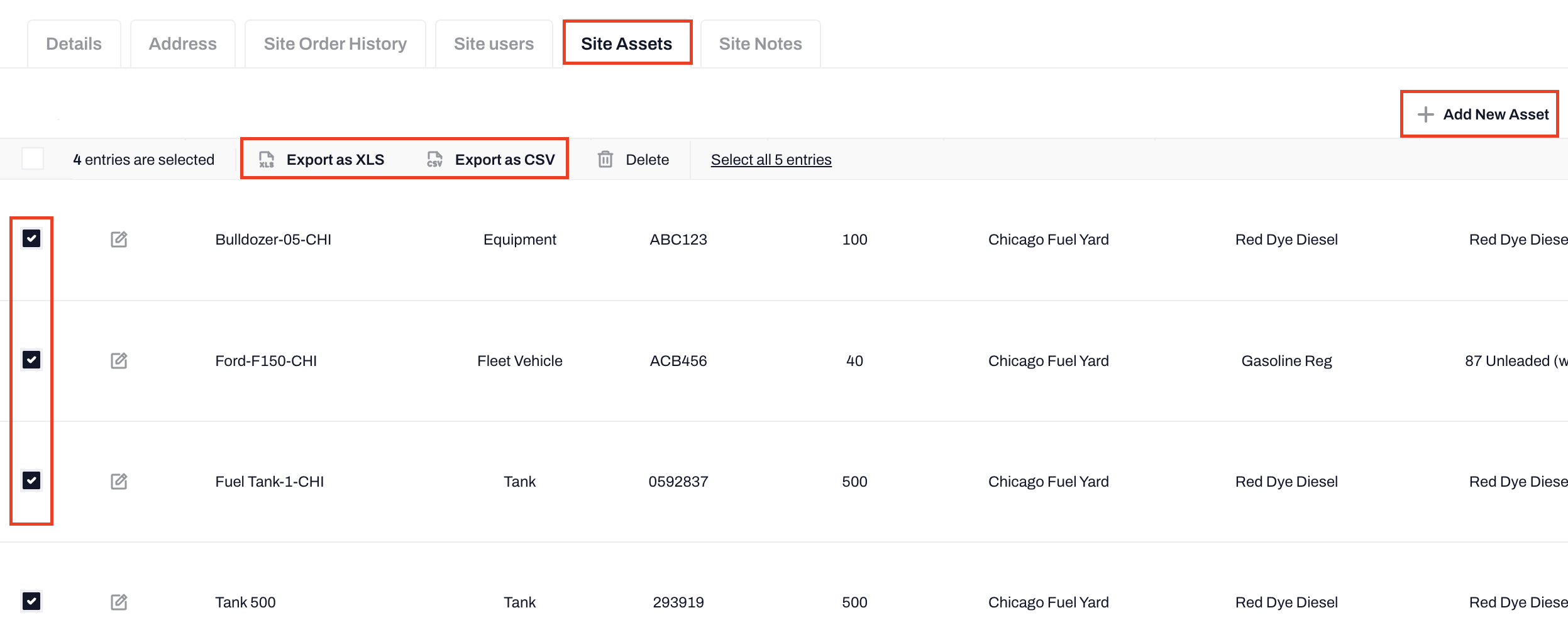 Selecting the box next to an Asset name will display the option to export the record(s) as an Excel or CSV file.