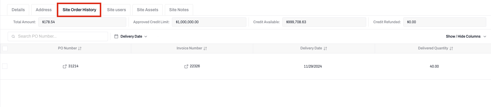 The Site Order History tab provides a detailed overview of all past orders associated with the Site allowing you to easily manage your Site's financial transactions, ensuring transparency and accountability for all Orders.