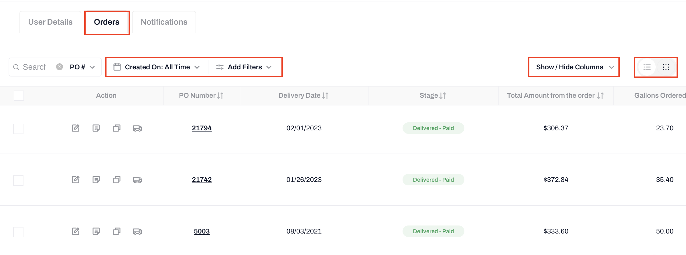 You can view the Order Details page and other information by selecting the view icon in the Actions column. All order information is shown including PO #, Delivery Date, Order Status, Address, and Gallons Delivered,