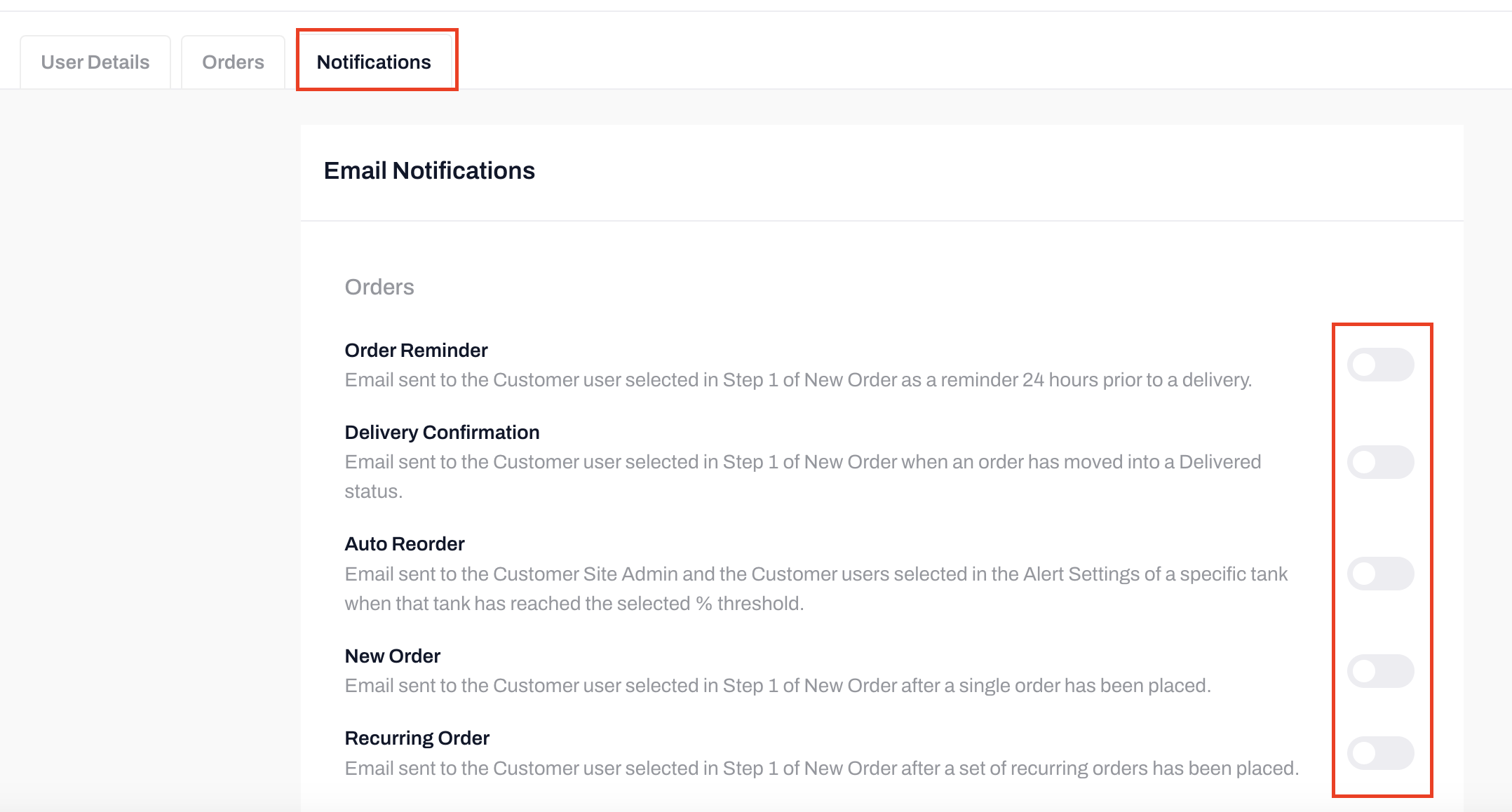 From within the User profile, you'll see three tabs: User Details, Orders, and Notifications.