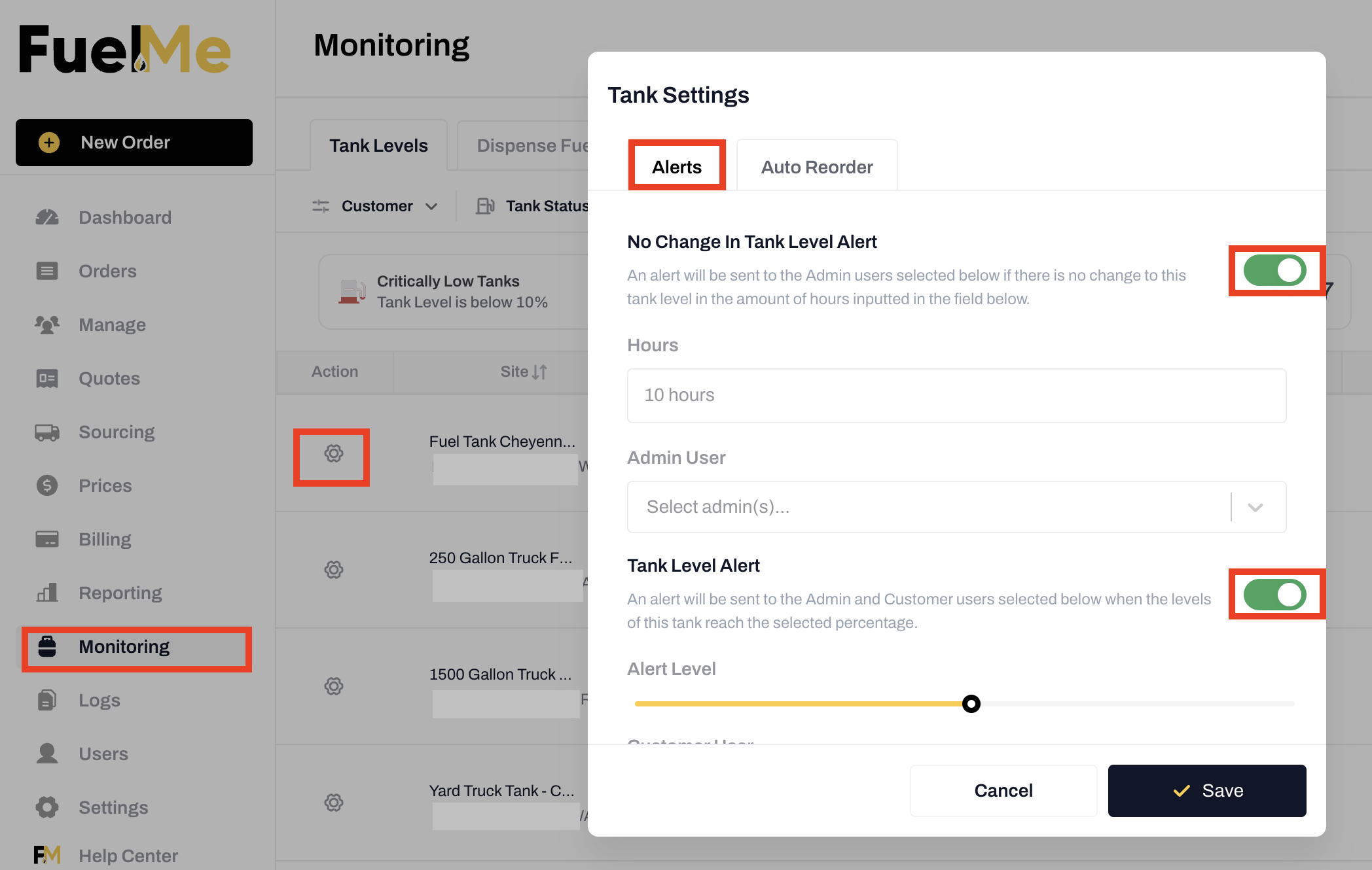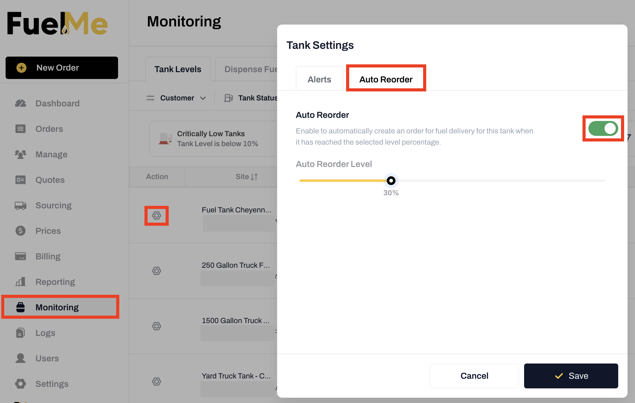 Once the integration is live, Fuel Me will receive daily pings from your tank monitors to provide live updates. You can set thresholds on each tank that will trigger an automatic fuel order through Fuel Me.