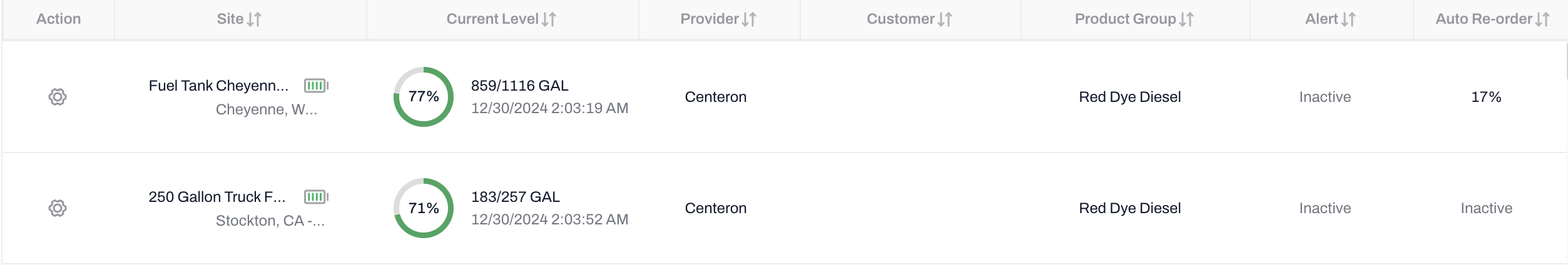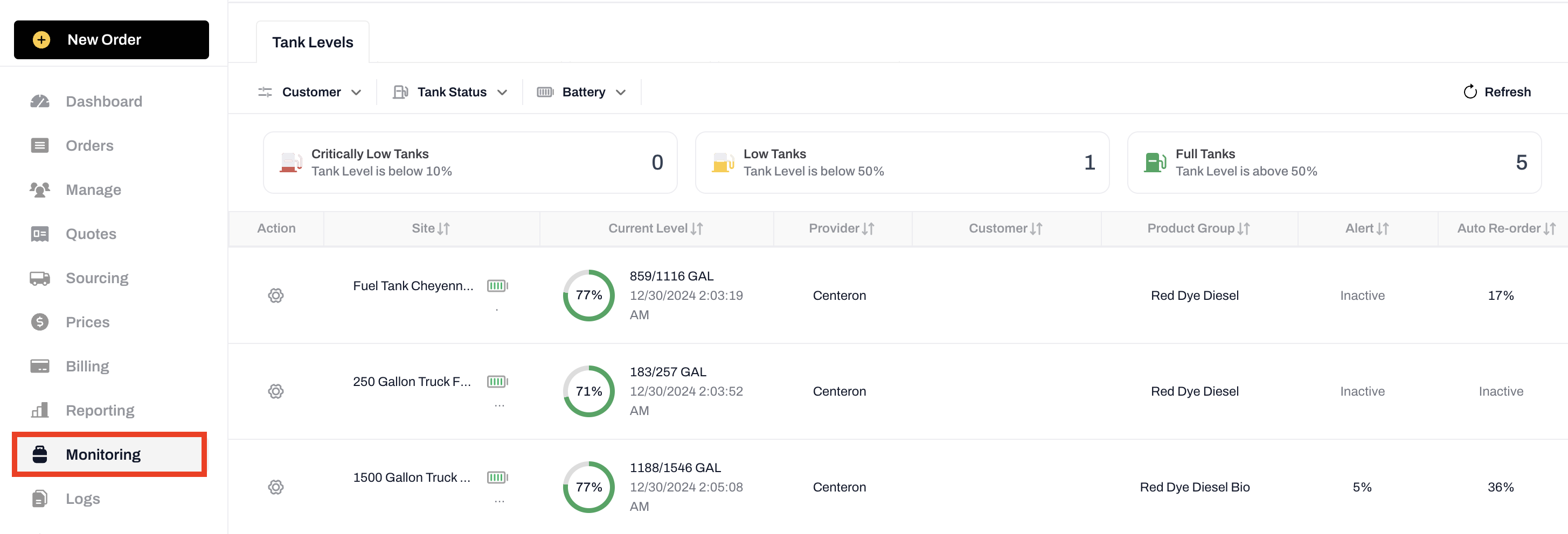 The Tank Monitor tab provides real-time monitoring and management of tank levels across sites, ensuring optimal fuel management and proactive refilling strategies.