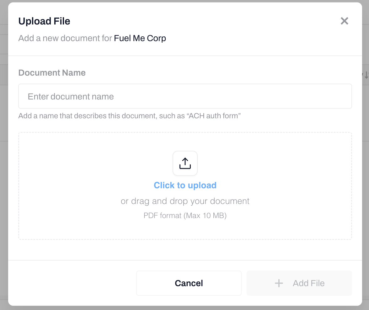To upload your W-9, navigate to 'Files' in the main sidebar menu, then click on the 'Files' tab, then click on + Upload File. Then either drag and drop or upload your PDF file into the pop-up window and click the '+ Add File' button.