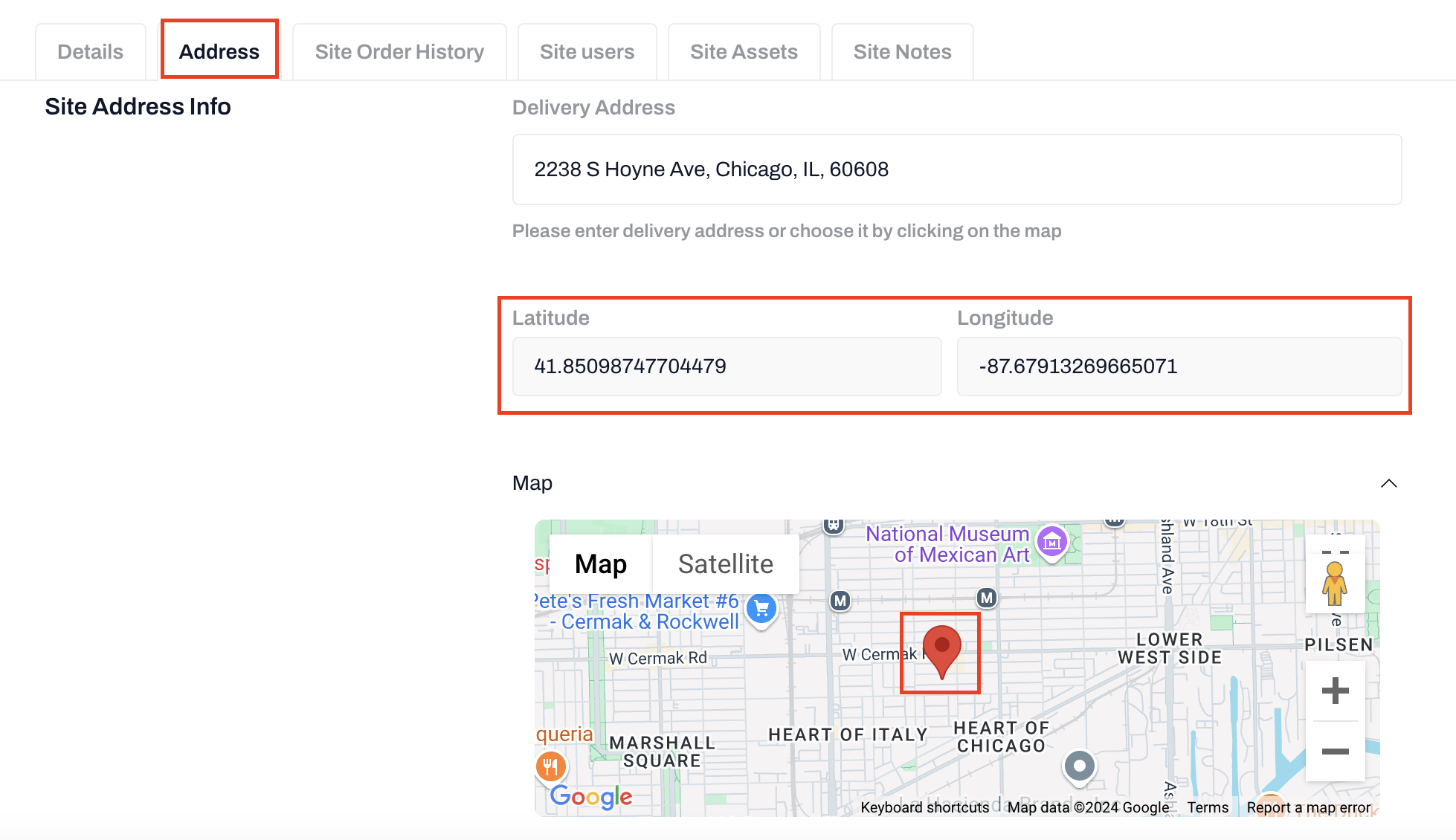 There may be instances where a fuel delivery Site does not have a registered address. For example, it could be a new construction site or a yard where the assets frequently move around. For these scenarios, Fuel Me allows you to enter the longitude and latitude of a Site location by dragging and dropping a pin on a Map view. You must set the Site Coordinates from within the Site record - these cannot be adjusted during the Fuel Ordering process.